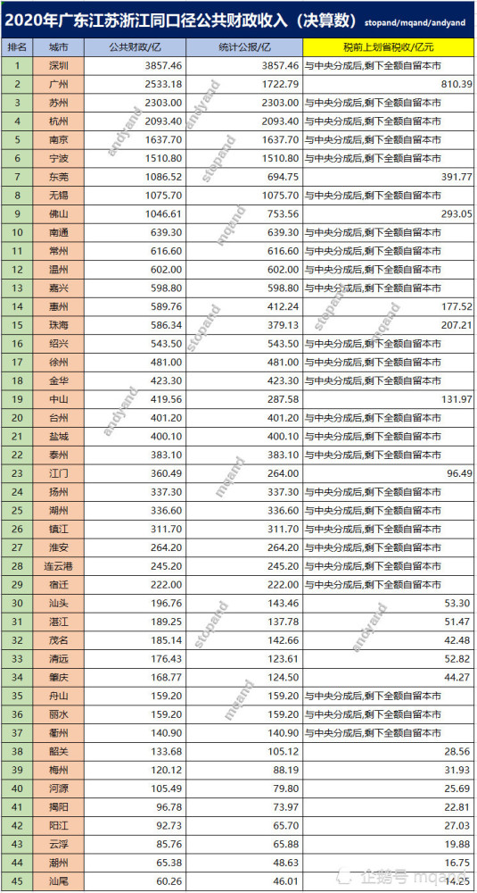 2020年广东江苏浙江各市同口径财政收入情况,苏州第三,宁波第六