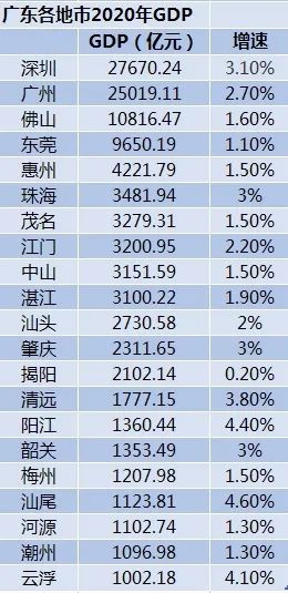 2017年广东各市GDP排名及增长率 21个市经济排行 表