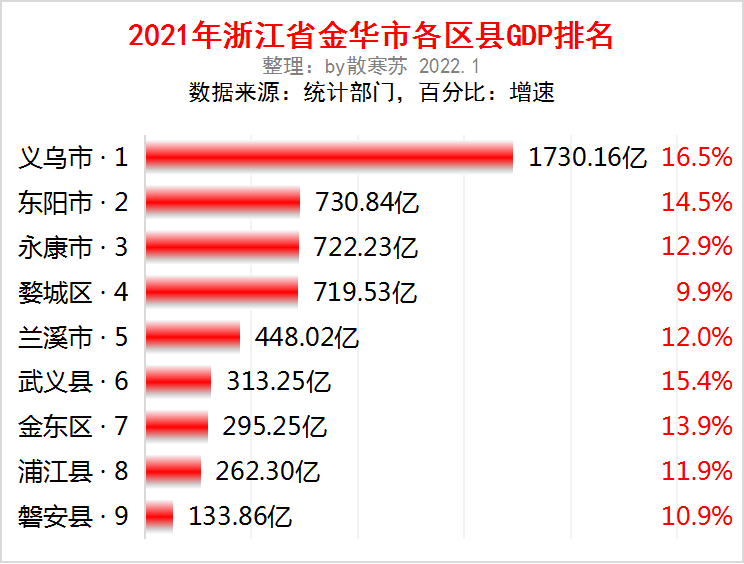 一、2021年浙江省金华市各区县GDP排名:1、义乌市, 1730.16亿 ,增速 16.5%2、东阳市, 730.84亿 ,增速 14.5%3、永康市, 722.23亿 ,增速 12.9%4、...