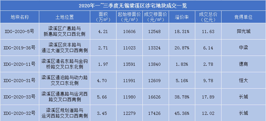 2020年前三季度无锡梁溪区宅地一览 一方面,主城区的地价正在以肉眼可见的速度向上攀升。