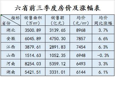 中部六省前三季度gdp及房价出炉