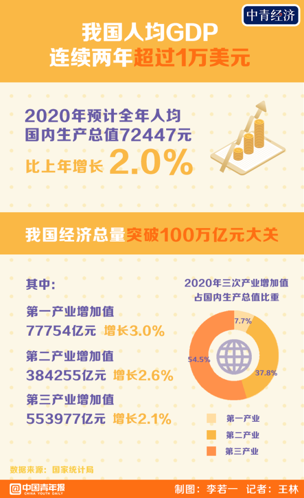 国家统计局2月28日发布的2020年国民经济和社会发展统计公报显示,2020年,我国经济总量突破100万亿元大关,预计全年人均国内生产总值72447元。