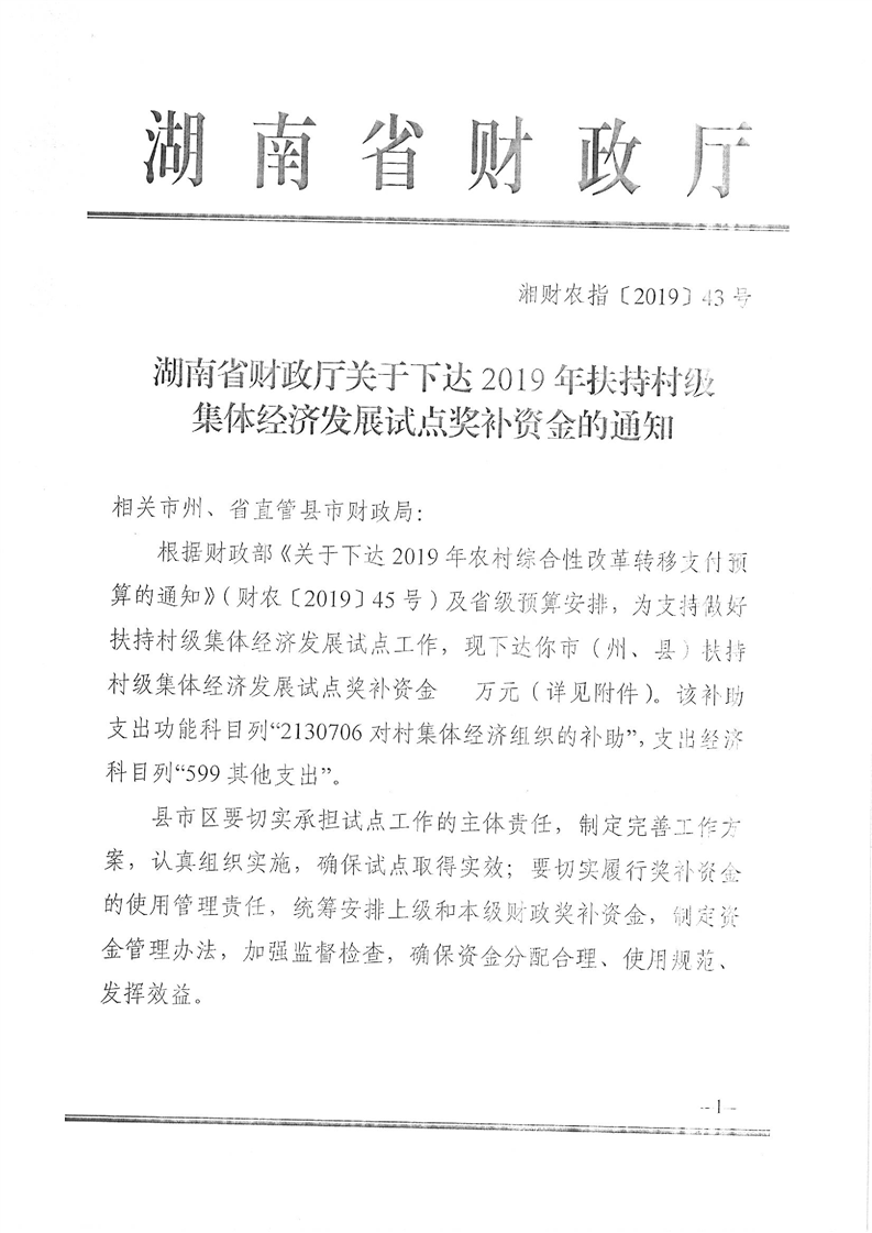2019年扶持村级集体经济发展试点中央和省级奖补资金公开