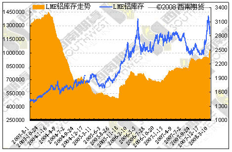 lme铝库存在3月初大幅增加,截止上周末库存总量达到1033875吨。