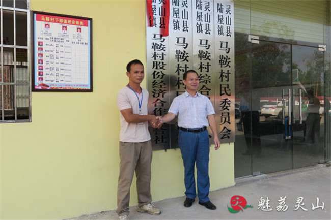 市委副秘书长陆全君为灵山县陆屋镇马鞍村股份经济合作联合社揭牌