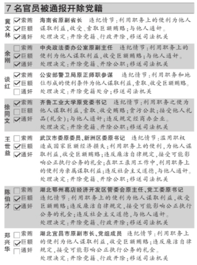 法制晚报讯( )昨日,中纪委网站先后发布消息,海南省原副省长冀文林、中央政法委办公室原副主任余刚、公安部警卫局原正师职参谋谈红、齐鲁工业大学原党委书记徐同文、武汉市委原委员王世益、宜昌市原副市长郑兴华、鄂州葛店经济开发区管委会原主任陈伯才7名官员