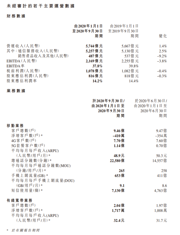 中国移动发布2020前三季度运营数据 收入5744亿元
