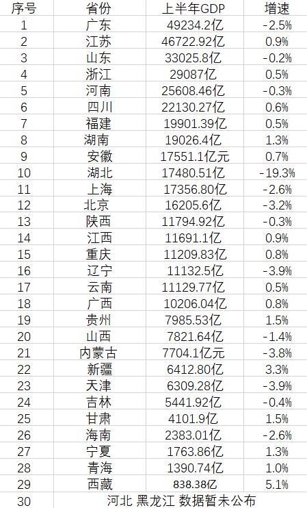 29省份上半年GDP公布 16个省份增速为正 江浙取得正增长
