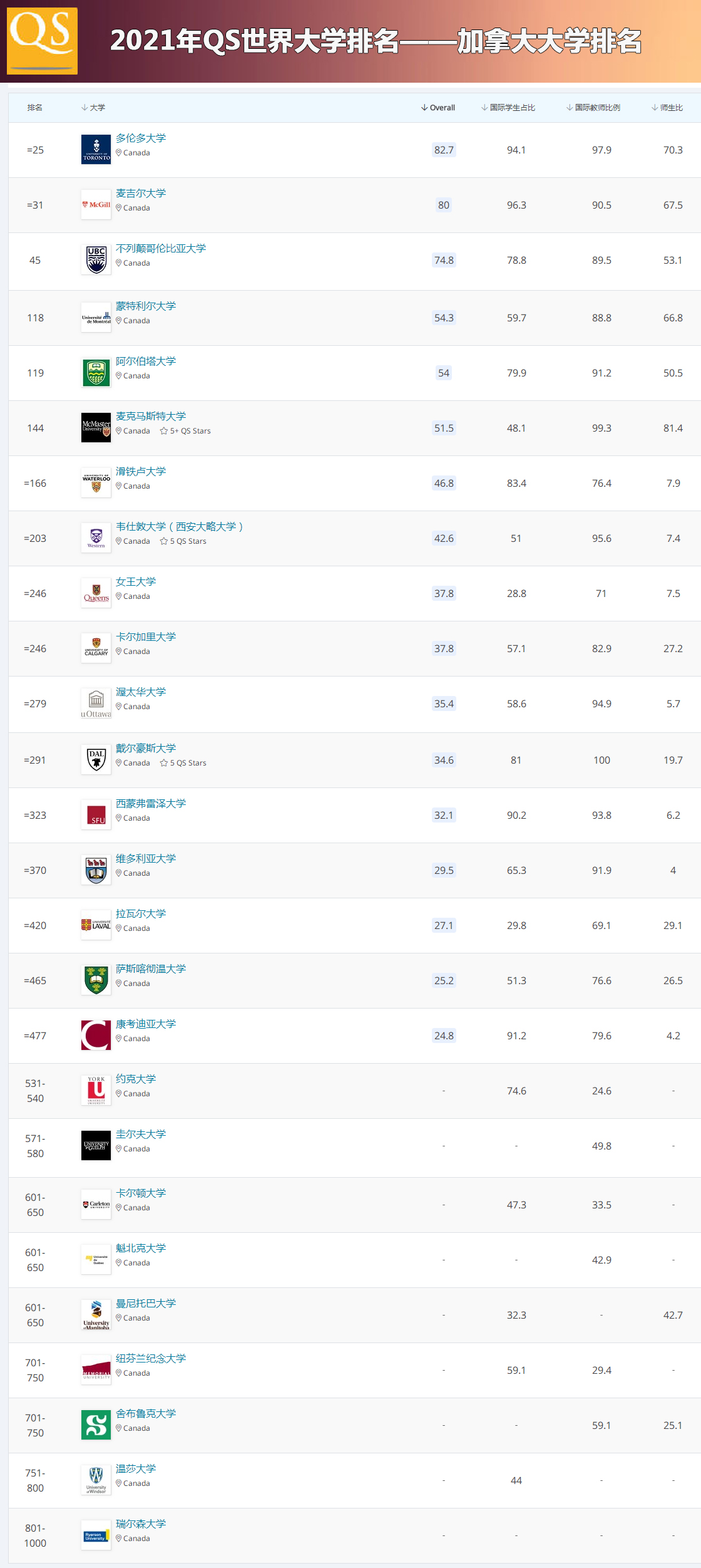 2021QS世界大学排名发布,中国大学创新高,加拿大整体排名提高